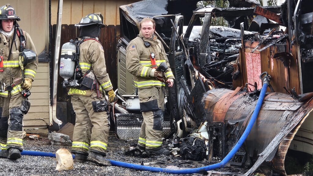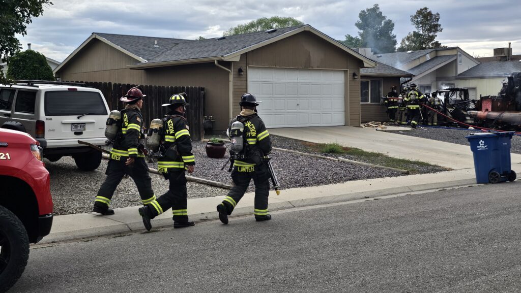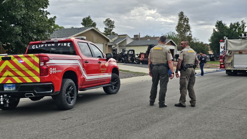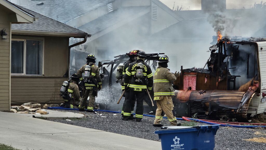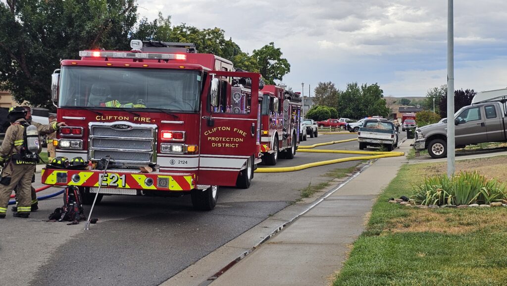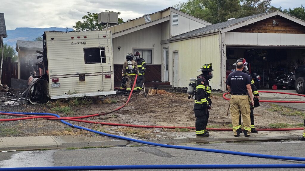 Camper reported on fire next to a home on Carson Lake Drive, just south of D 3/4 Rd in Clifton. The RV was fully engulfed in flames when responders arrived, also engulfing another nearby tow trailer. The fire spread to the sides of both bordering homes but was kept under control by fire crews. A large column of black smoke from the incident was seen across Clifton. Responders forced entry to one of the neighboring homes and did not locate any residents inside at the time. One dog was safely removed from the home and checked by Animal Control.