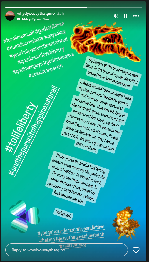 Videos posted on an Instagram account belonging to a missing resident of the apartment the explosion originated from, indicate his involvement in the incident. Andrew Alderman of Palisade lived in the apartment below of an individual that was killed in the apartment complex explosion. Alderman committed suicide at the Twin Lakes boat ramp the evening of the incident.
