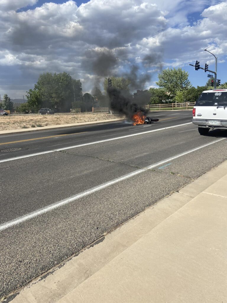 Single motorcycle crash on Unaweep and 29 Rd. The bike caught fire in the middle of the road. Fire and police are responding to the area.