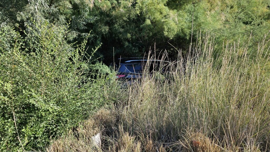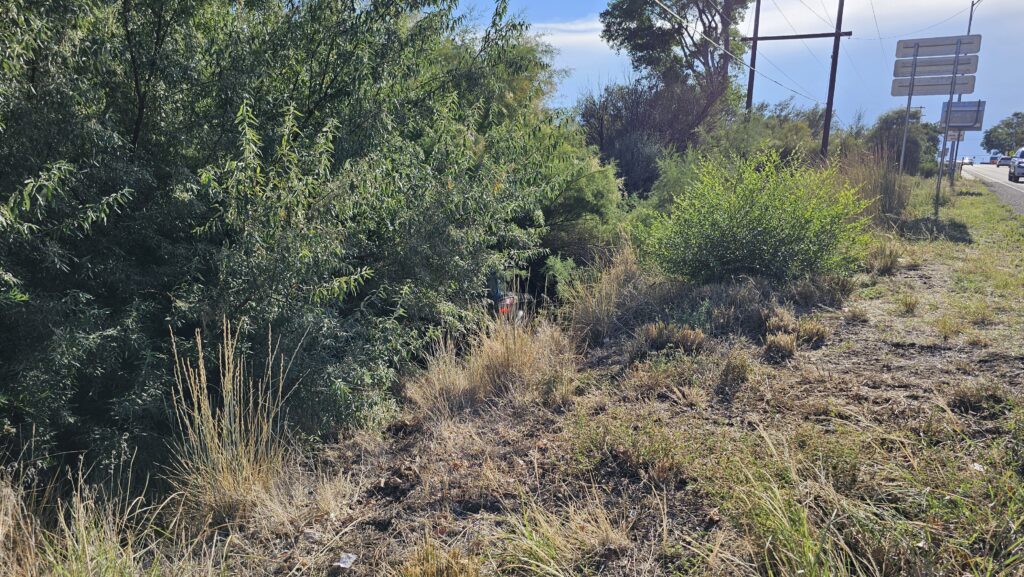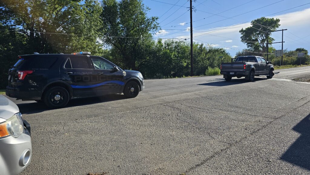 Two vehicle accident at G Road and 38 Road in Palisade. One vehicle went over a small hill filled with brush and trees near the river.