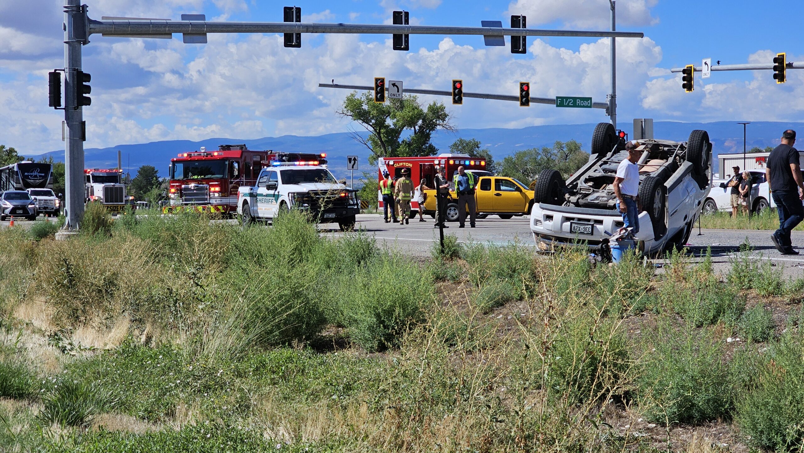 Multi vehicle accident, one with rollover. Yellow truck vs a white SUV at the intersection of F 1/2 Rd and I-70 BL in the north bound lanes that lead to I-70. Its reported that one of the vehicles ran a red light.