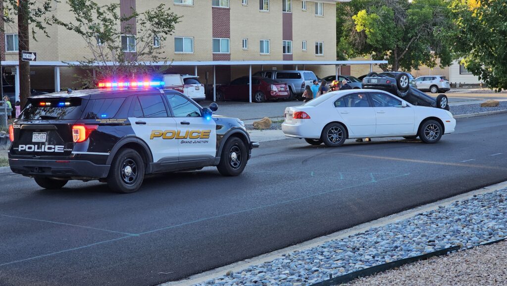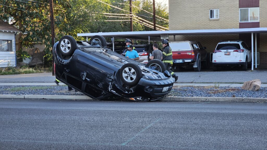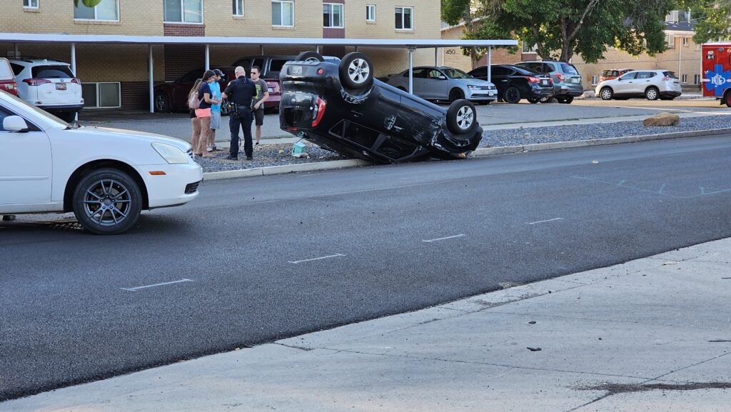 Two vehicle accident with one rollover. No one was hurt. Driver was able to escape rolled vehicle through driver window.