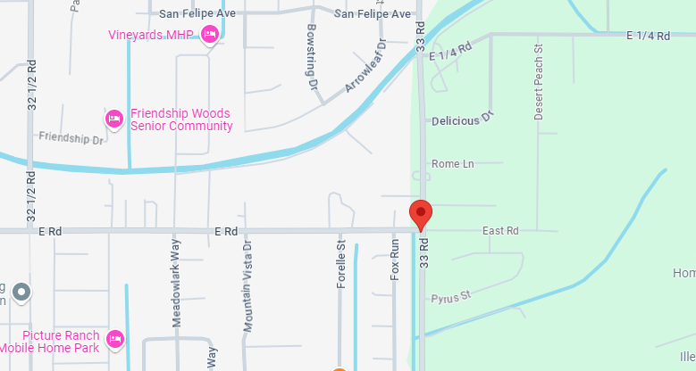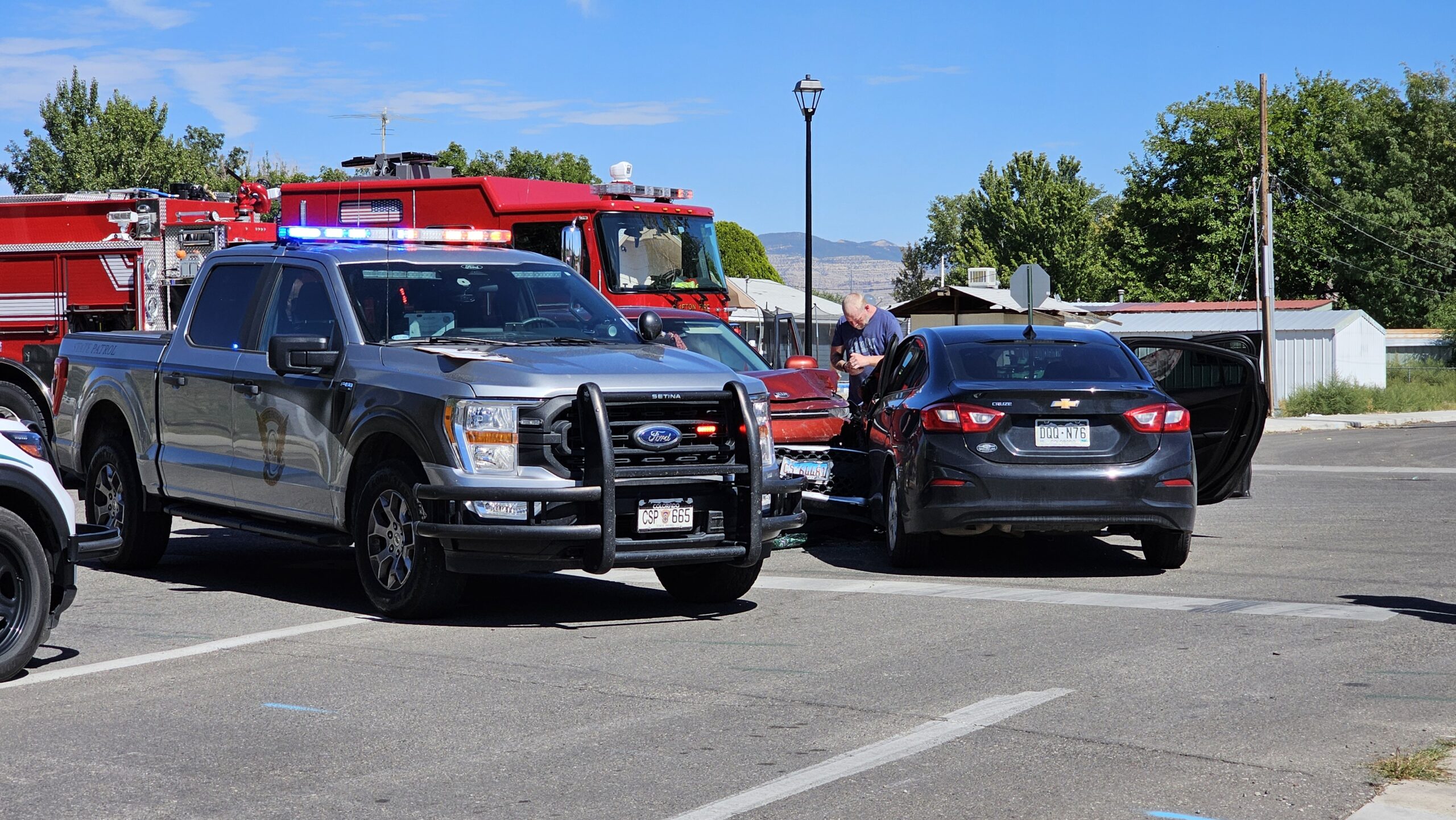 Two vehicle accident at E Road and 33 Road in Clifton. Head on collision with airbag deployment between a black sedan and a red SUV. One person required an ambulance for a moderate head injury.