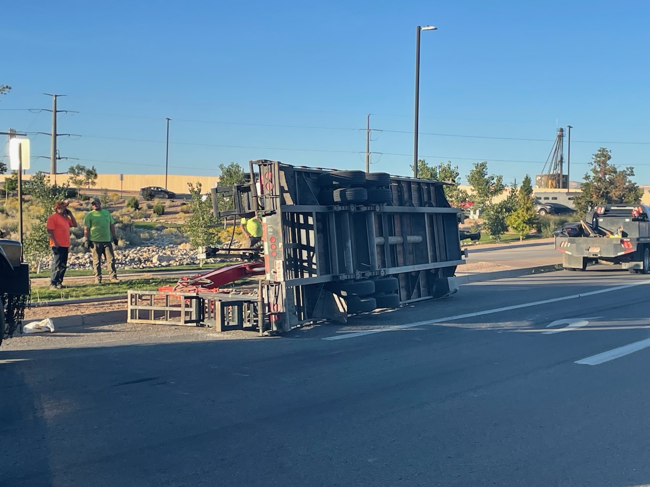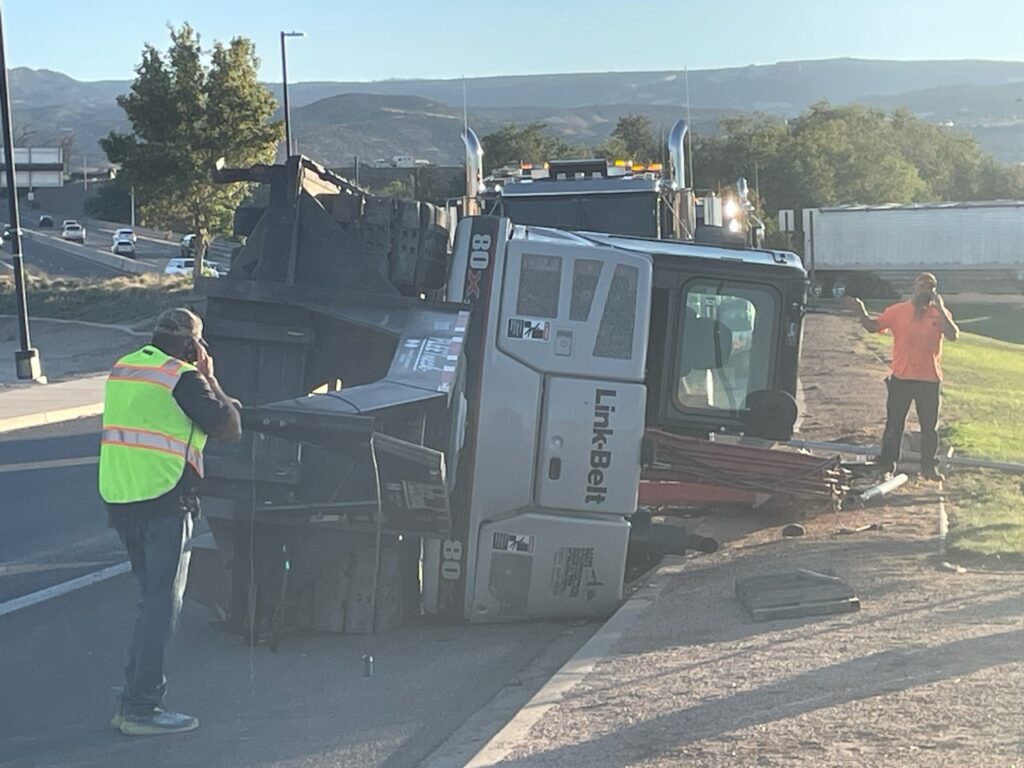 A semi trailer making the off-ramp turn tipped over its trailer. No other vehicles are involved and the semi truck itself is still on its wheels.