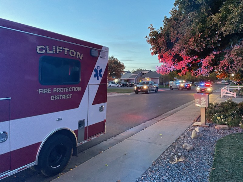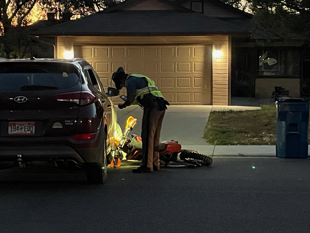 Single motorcycle / dirt bike crash into a vehicle on Green Acres Dr near E Rd and 32 1/8 Rd in Clifton. Rider is unconscious and medical crews are performing CPR.