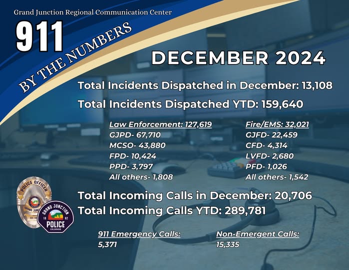 The Grand Junction Regional Communication Center (GJRCC) has released its December and year-end dispatch statistics for 2024. In December alone, the center handled 20,706 incoming calls, including 5,371 emergency 911 calls and 15,335 non-emergency calls. These resulted in 13,108 dispatched incidents.
