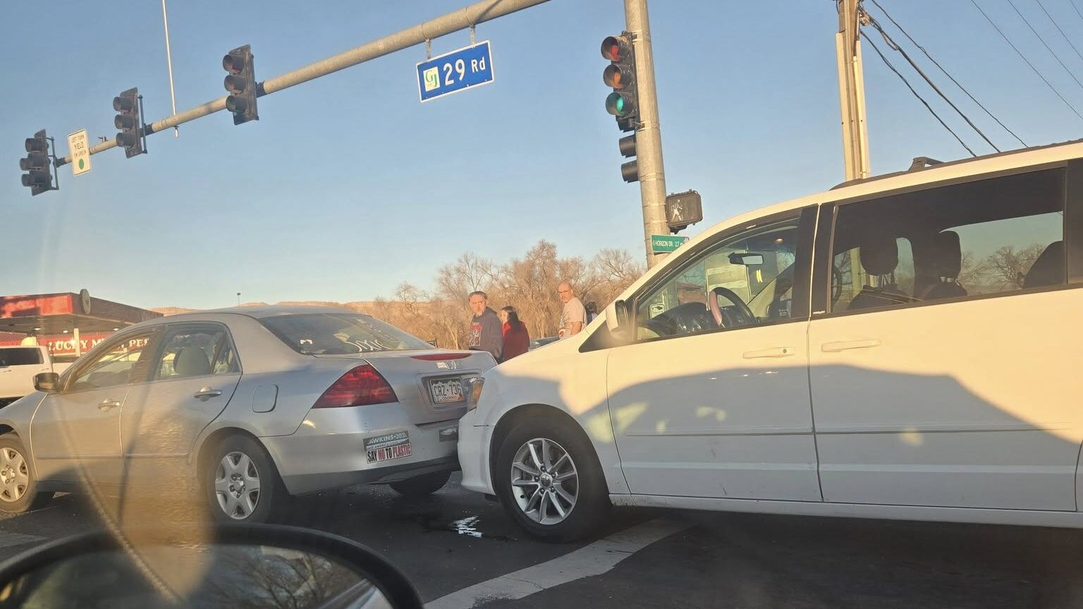 Vehicle accident and disturbance at 29 Road and Patterson Road. Several callers are reporting multiple vehicles involved in an accident with people arguing and fighting each other at the accident scene. At least one male is laying on the ground with a bloody face. The crash is blocking all lanes on Patterson at 29 Road.