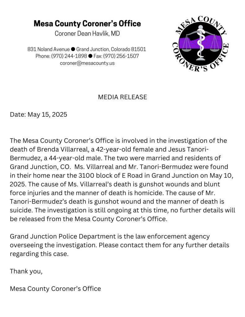 Grand Junction, CO – May 15, 2025 – The Mesa County Coroner’s Office has released details regarding the deaths of Brenda Villareal, a 42-year-old woman, and Jesus Tanori-Bermudez, a 44-year-old man, who were found deceased in their home near the 3100 block of E Road in Grand Junction on May 10, 2025. The couple, who were married and residents of Grand Junction, were identified by Coroner Dean Havlik, MD.