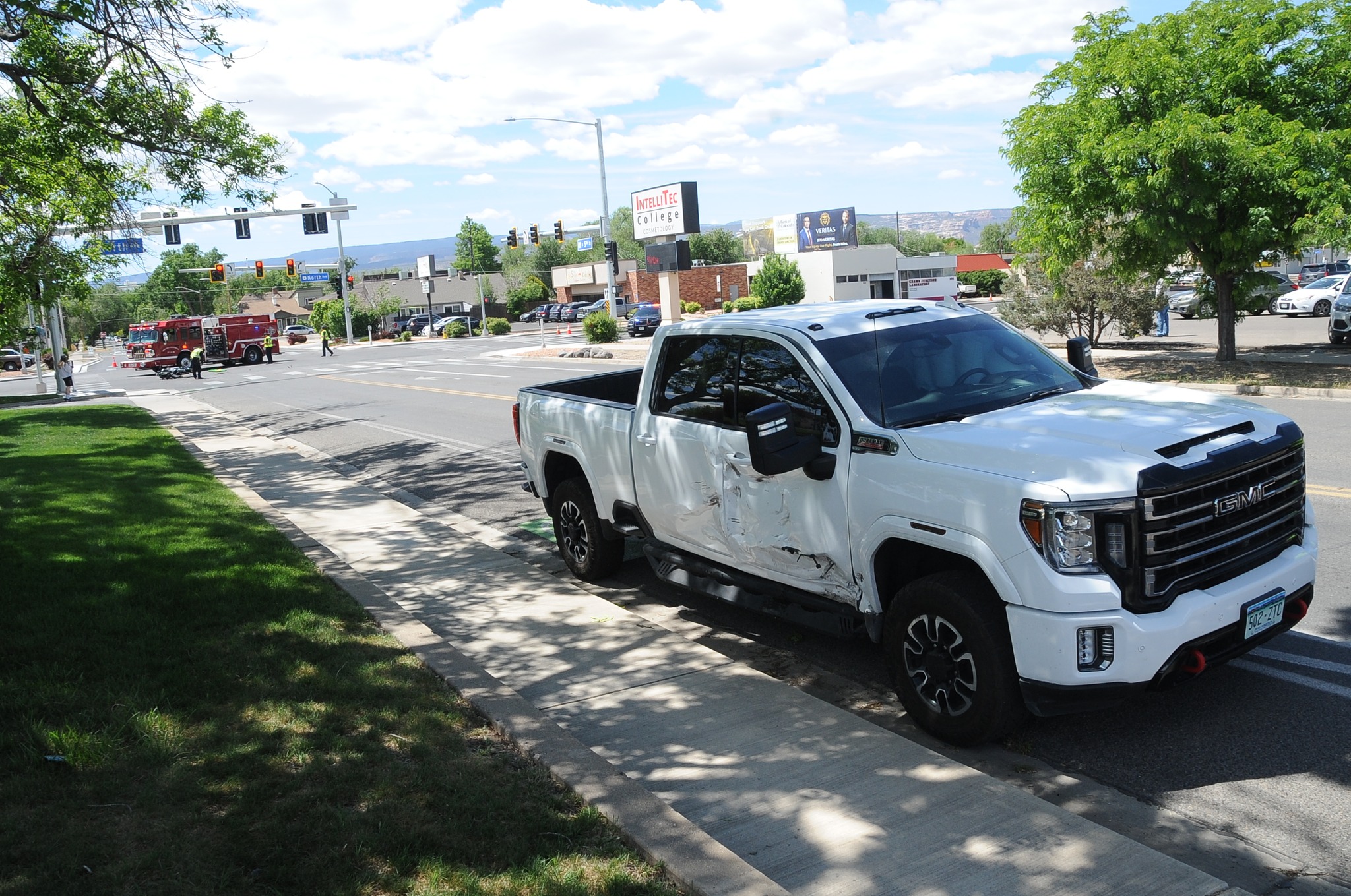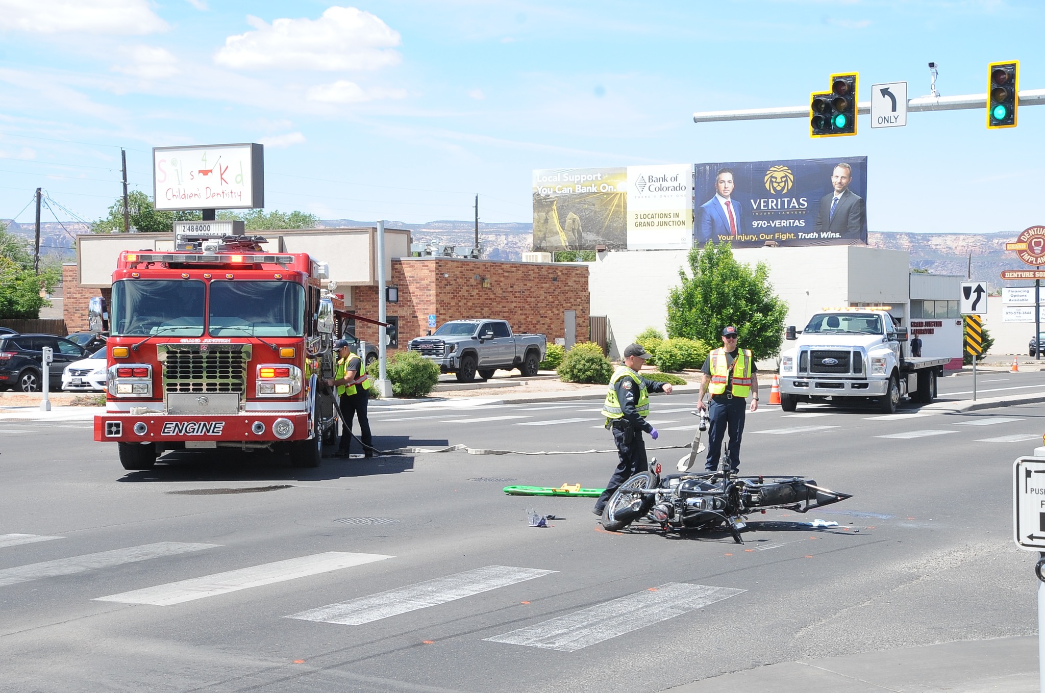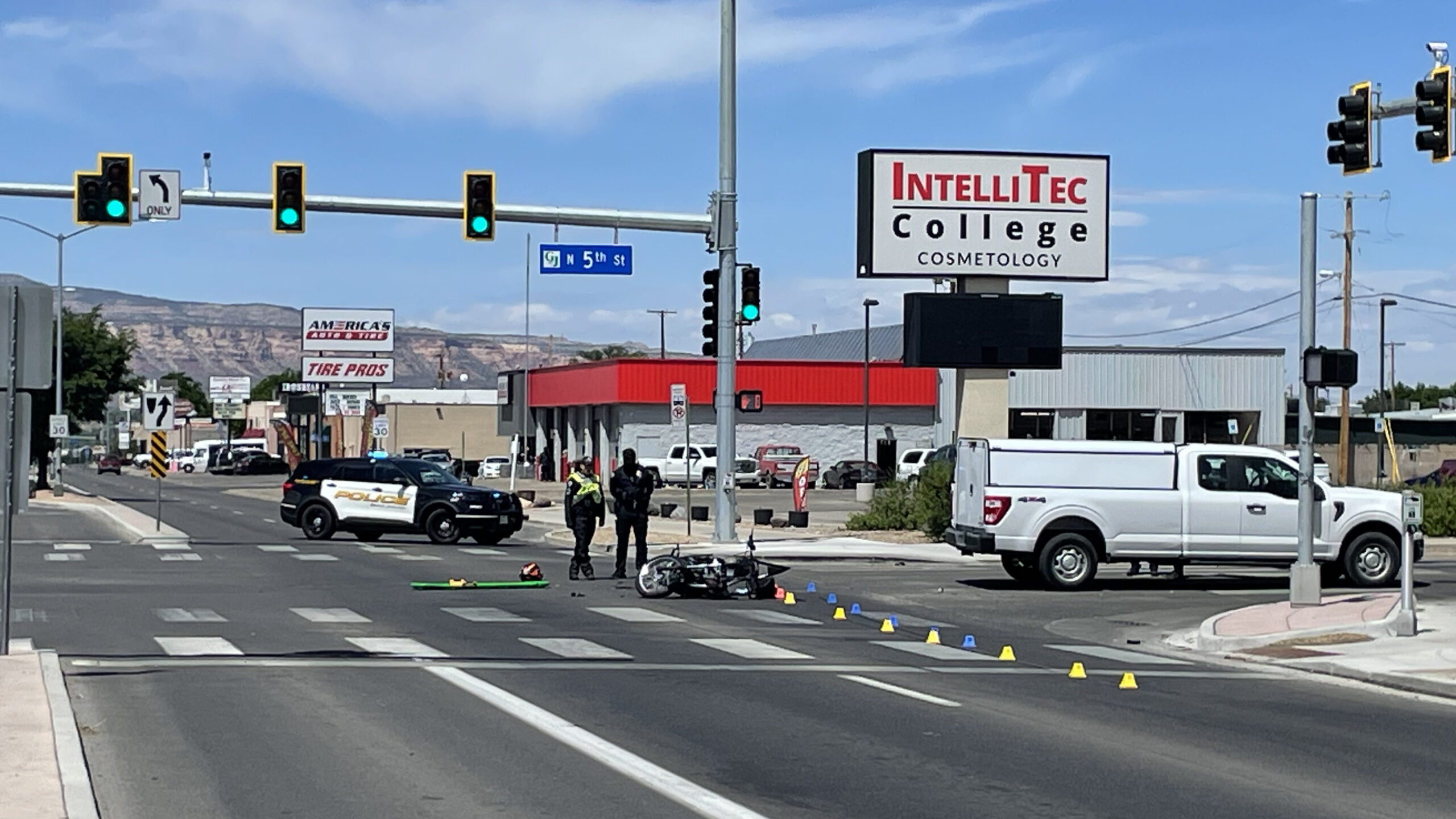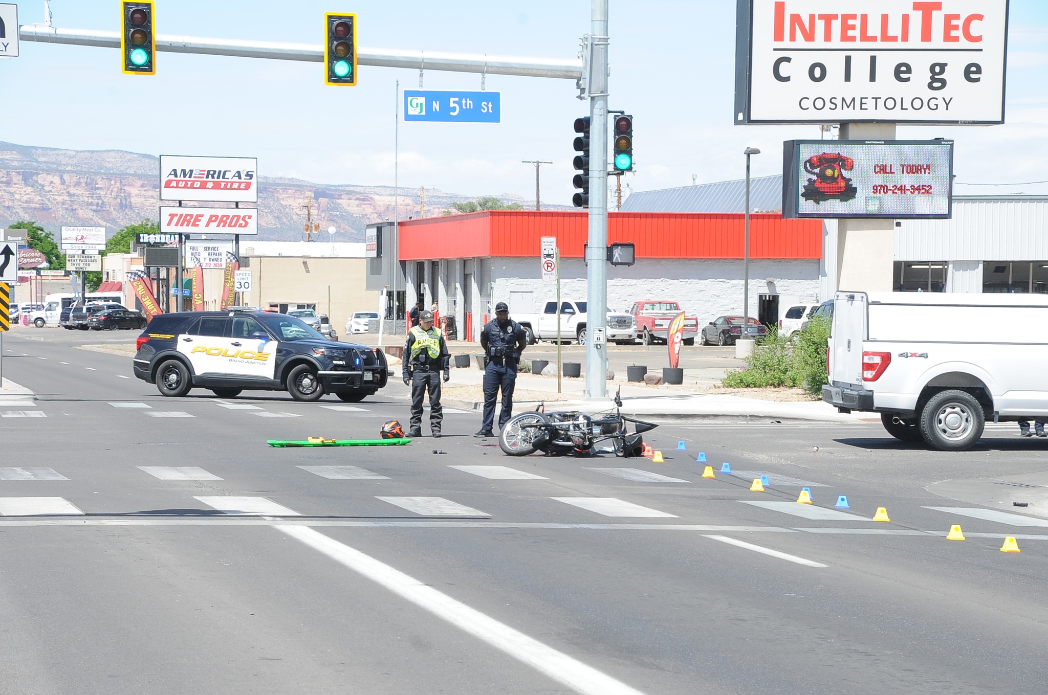 First responders with the GJPD and Grand Junction Fire Department are on scene at North Avenue and N 5th Street for a fatal motorcycle vs vehicle crash.