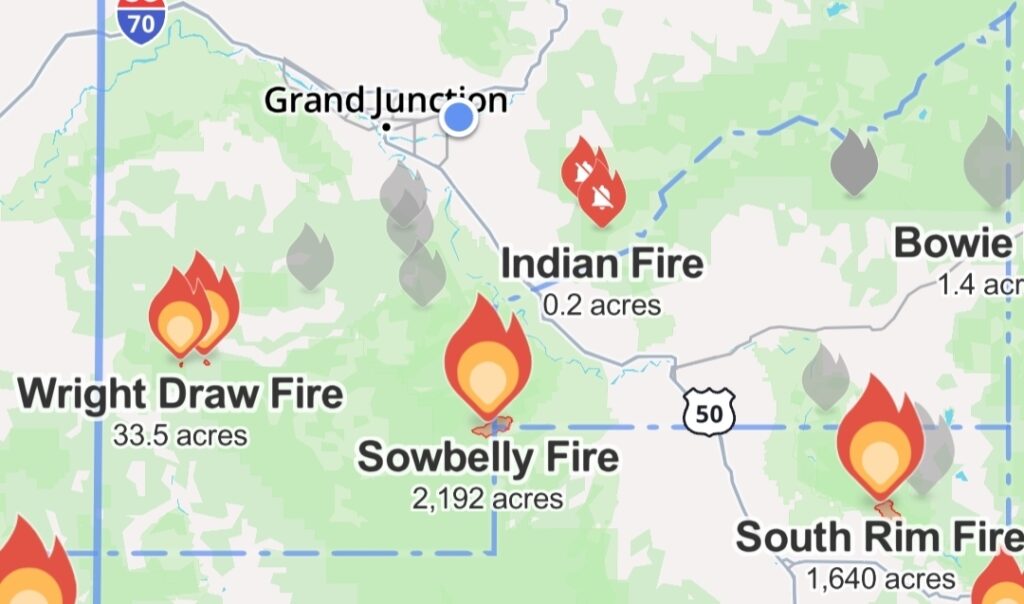 The Upper Colorado River Interagency Fire Management Unit reports roughly 10 new lightning-caused fires across the dispatch area. Notable incidents northeast of Gateway along Highway 141 — Turner Gulch Fire (50–75 acres), Gibbler Gulch Fire (≈0.5 acre), and Wright Draw Fire (15+ acres) — are being attacked with engines and aircraft and remain far smaller than Sowbelly at this time.