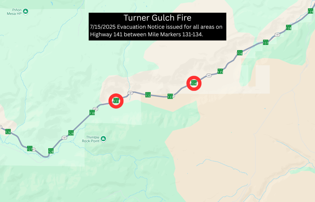 EVACUATION NOTICE – As of July 15, 2025 at 12 p.m., Evacuation Orders have been given for all private land and areas between Mile Markers 131 and 134 along Highway 141 in Gateway, Colorado.