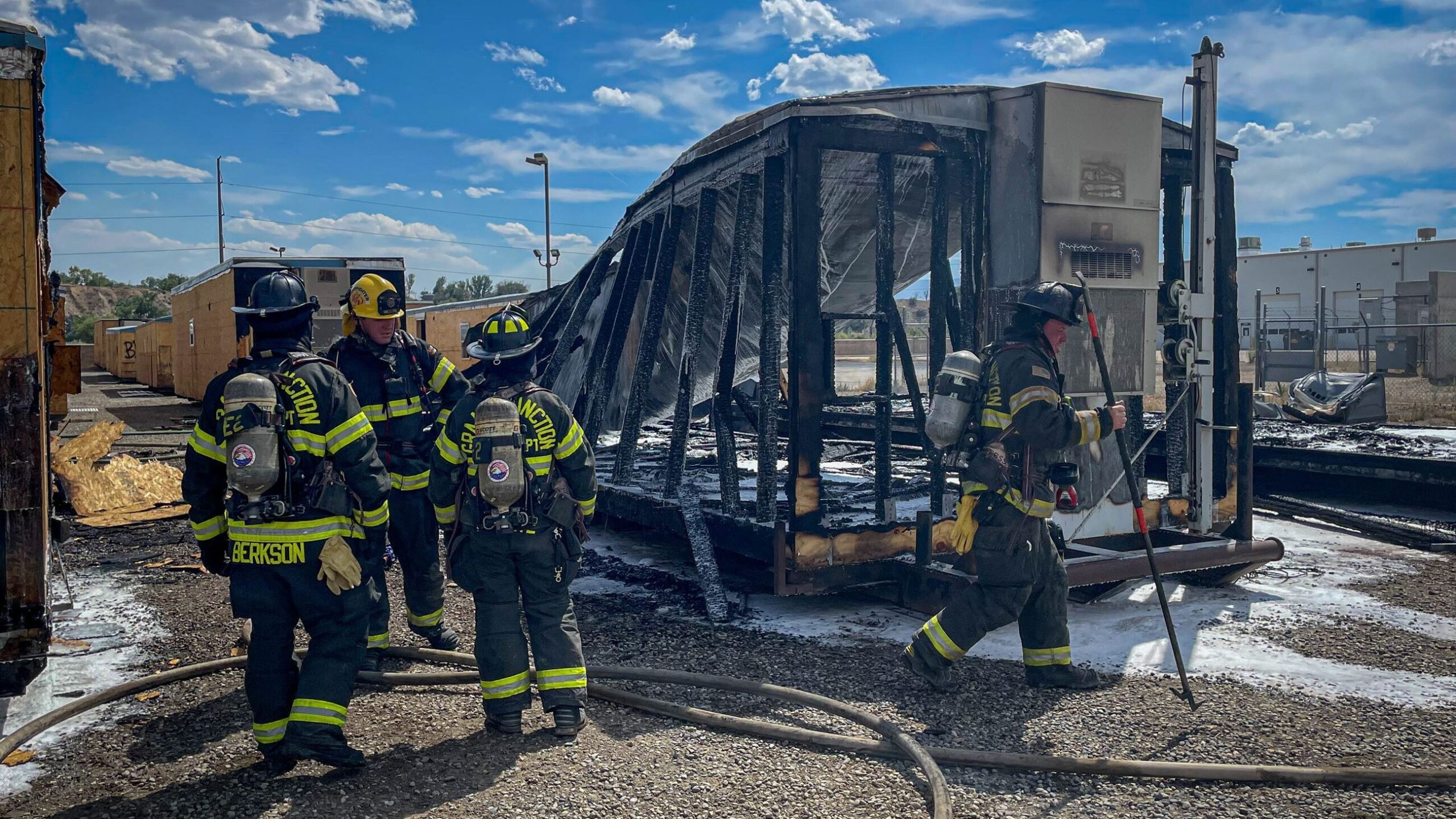 GRAND JUNCTION, CO – A fire broke out at approximately 2:32 p.m. on 365 32 Road, prompting a response from the Grand Junction Fire Department (GJFD) and the Clifton Fire Protection District. Initially reported as a possible motor vehicle fire, crews arrived to find multiple modular buildings engulfed in flames.