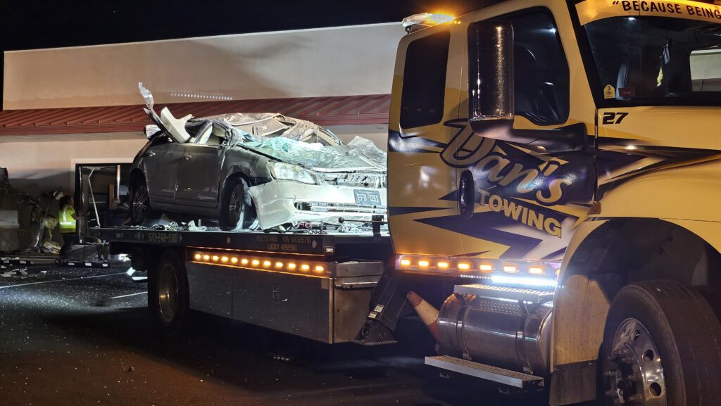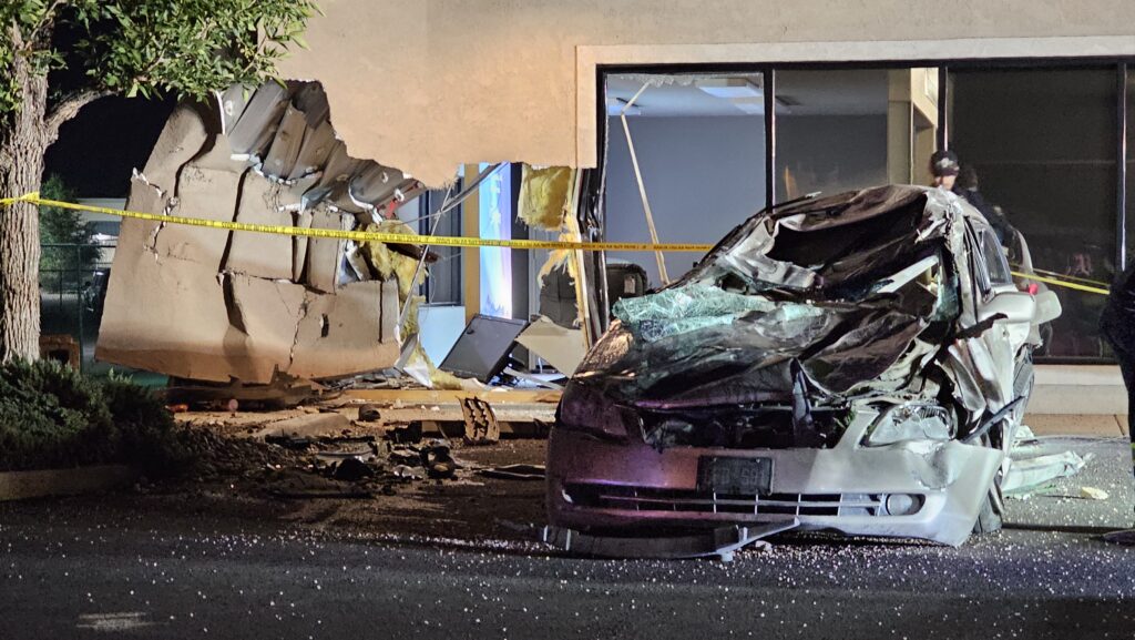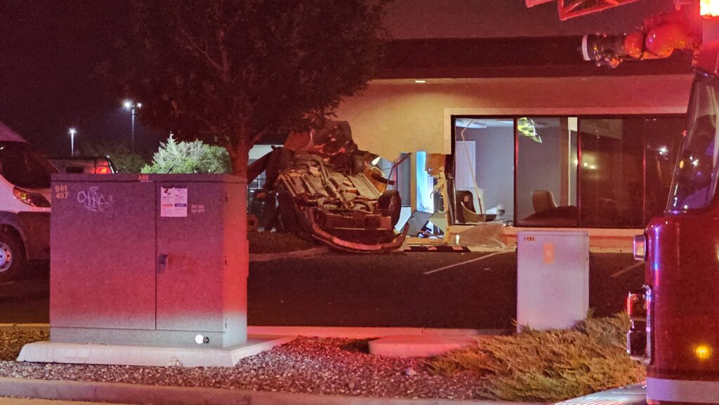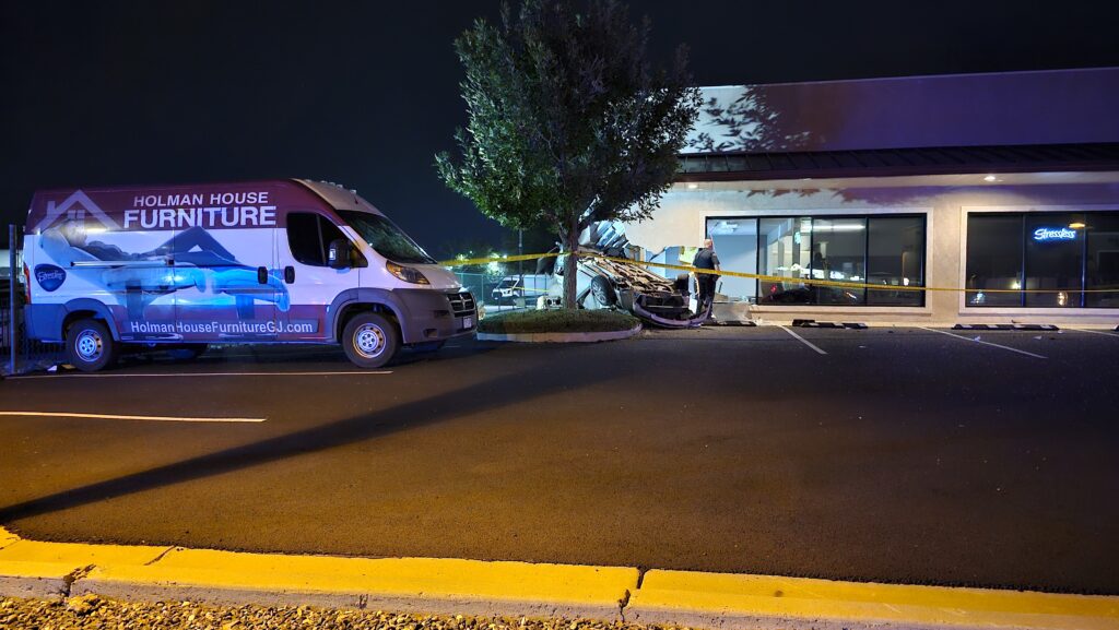 Single vehicle rollover crash into the Holman Furniture building at 2494 Highway 6&50 just west of 25 Road. Vehicle is a gold four-door Lexus that ran a red light before crashing into the building. Occupant(s) are safely out of the vehicle.