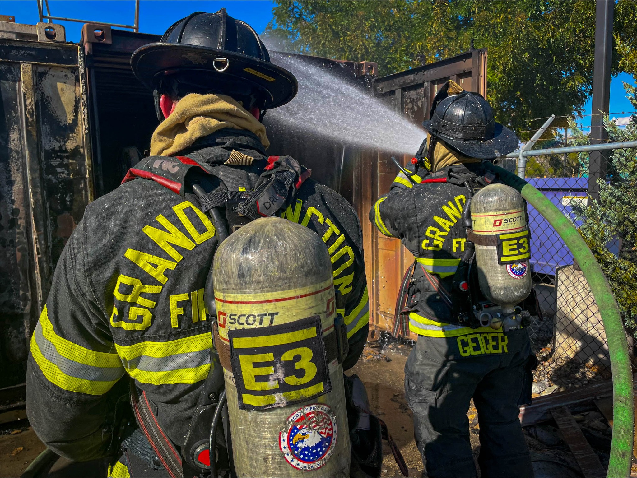 Report of a Conex container on fire at the Bishop Lifting business located on Scarlet Drive near Highway 6&50, just south of I-70. Both smoke and flames are seen from the container, which is located about 40 feet away from the building.