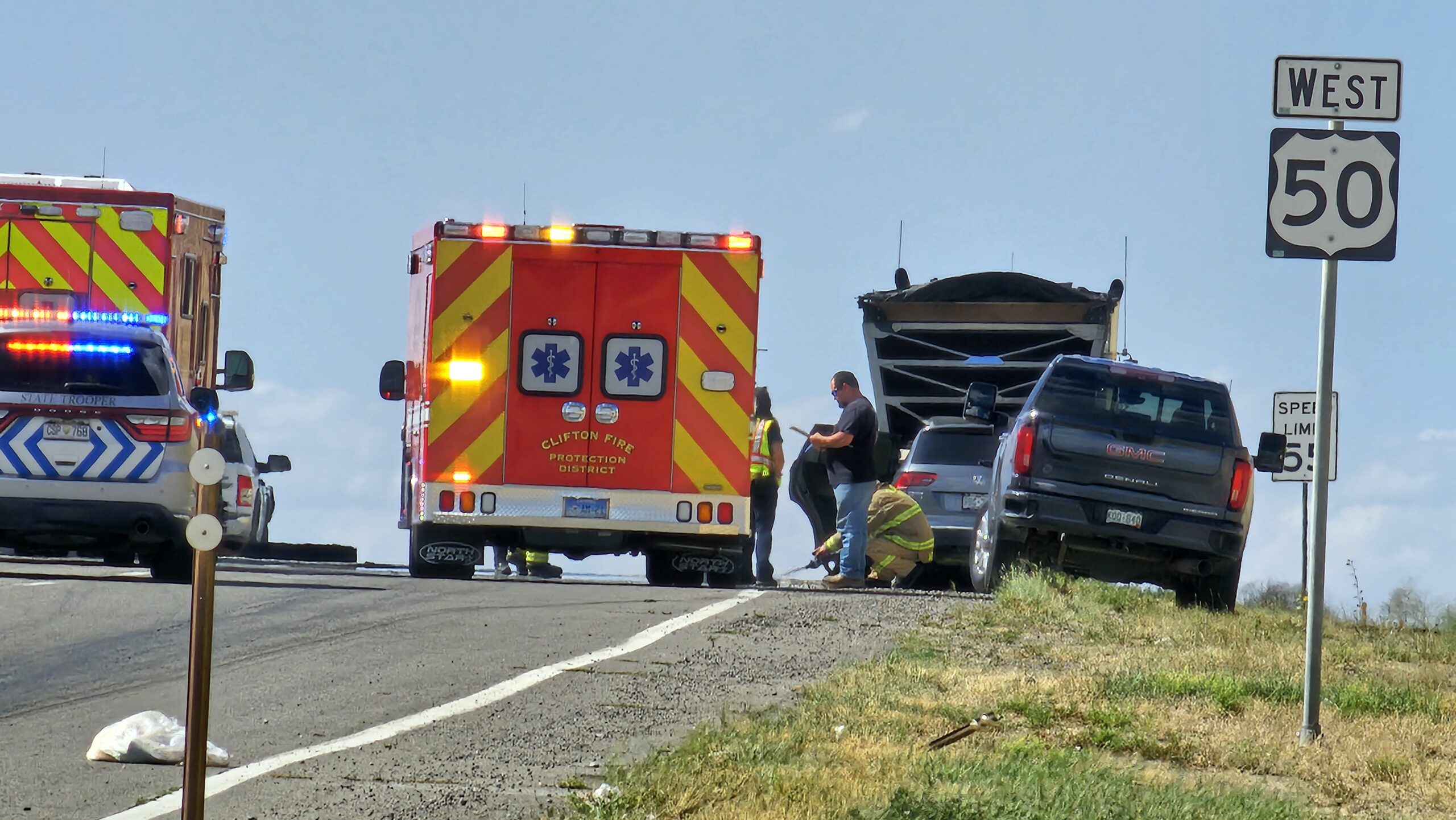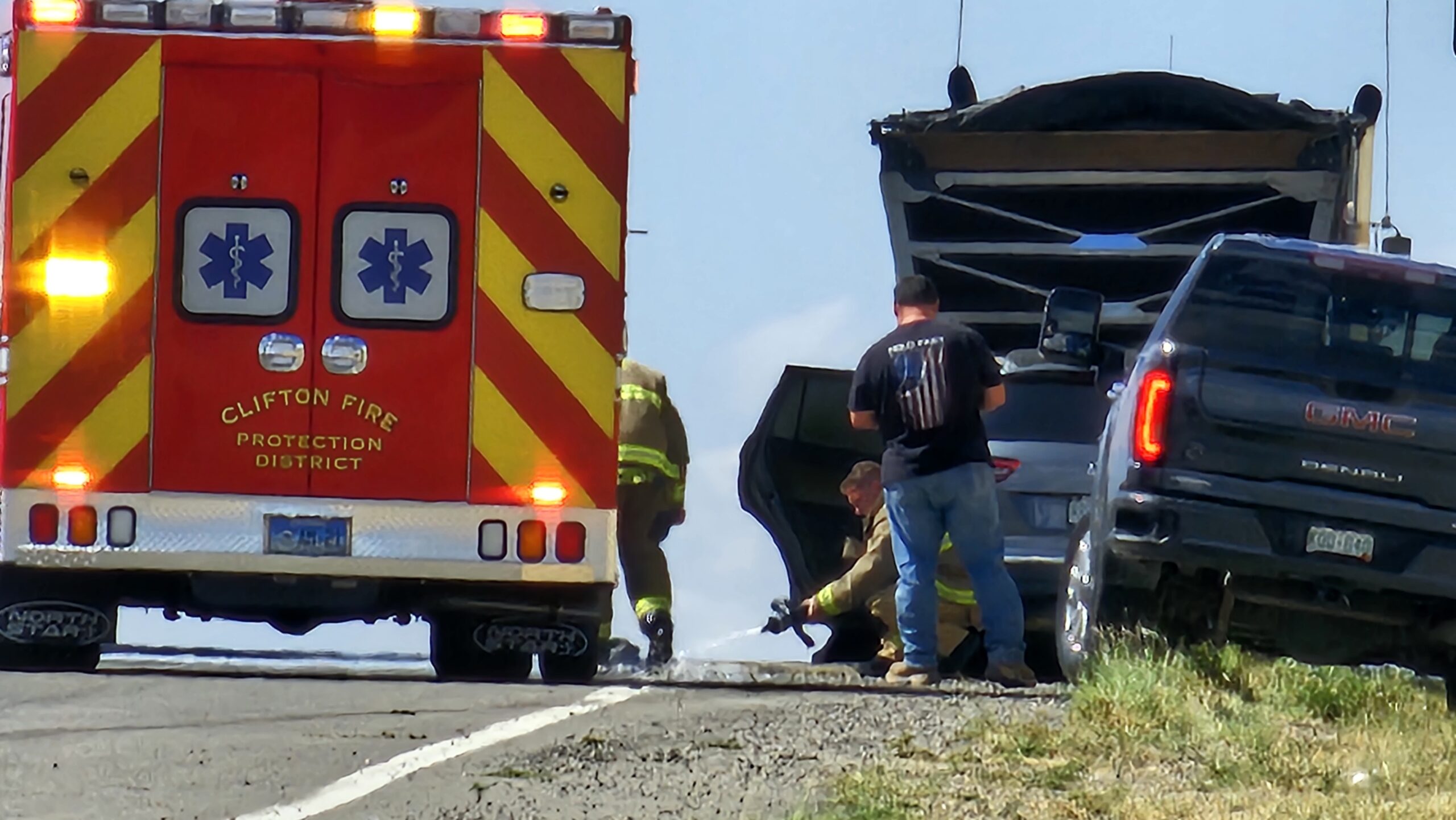 Vehicle accident with a car rear-ending a semi dump truck near Highway 50 and 32 Road. Responders are reporting flames coming from the vehicle, starting to spread to the semi. Bystanders stated that the driver was seen stumbling around after exiting the vehicle.
