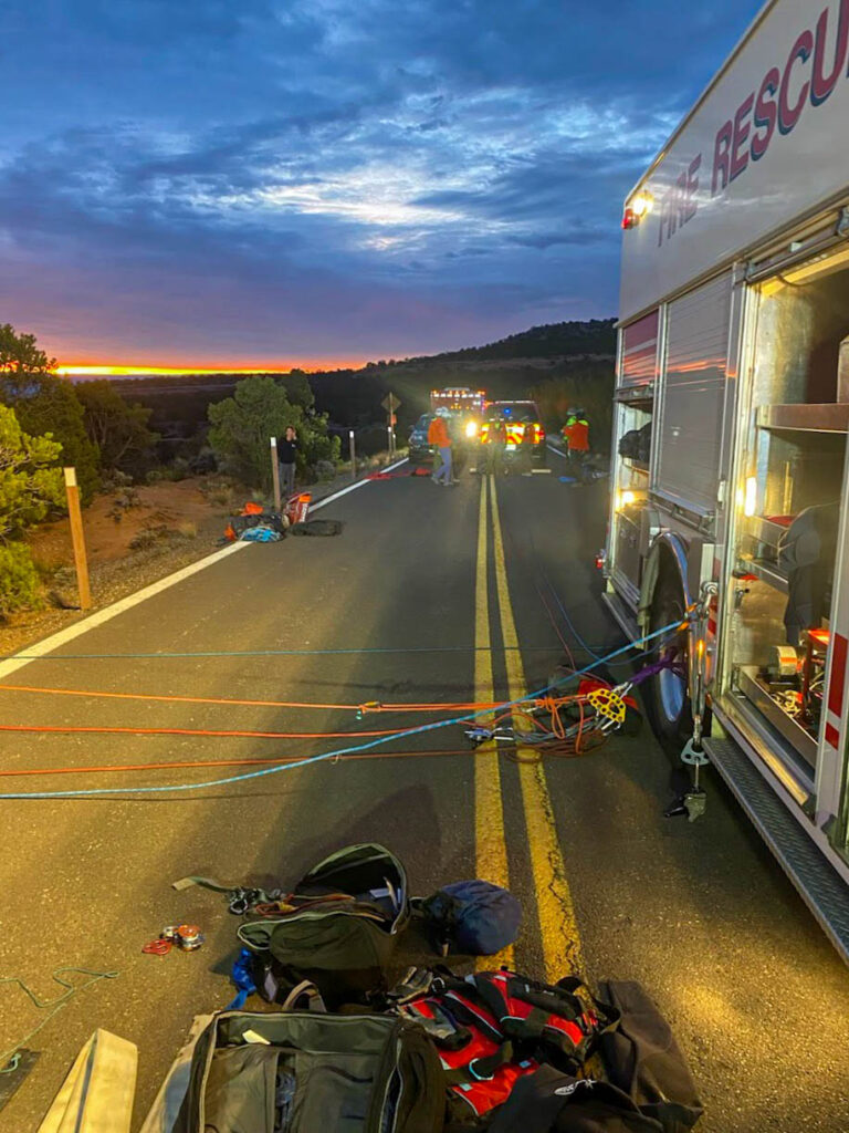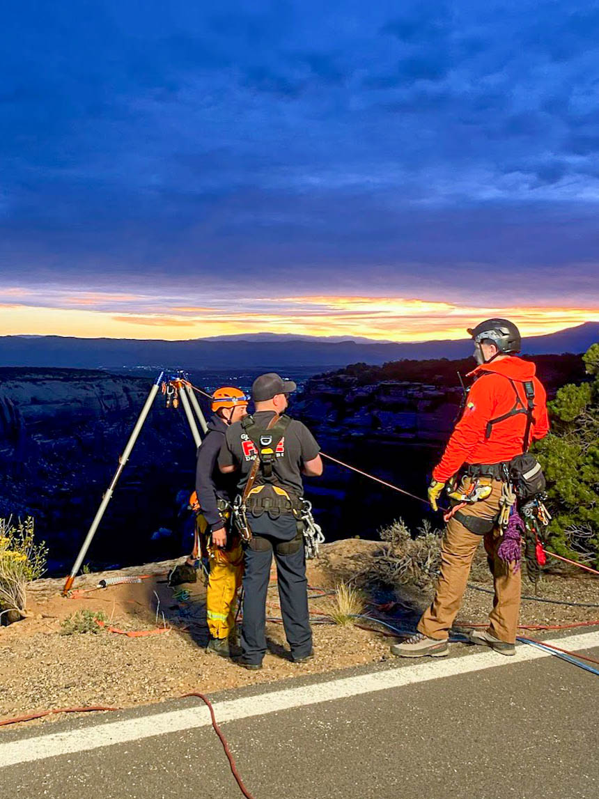 At approximately 4:13 a.m., Grand Junction Fire Department responded to reports of a vehicle that had driven off the edge of the Colorado National Monument. The vehicle was located about 100 feet down a ravine and was inaccessible by foot. Working alongside Colorado National Monument Rangers and Mesa County Search and Rescue, GJFD crews conducted a high-angle rope rescue to reach the vehicle and extract the patient, who was then transported by CareFlight.