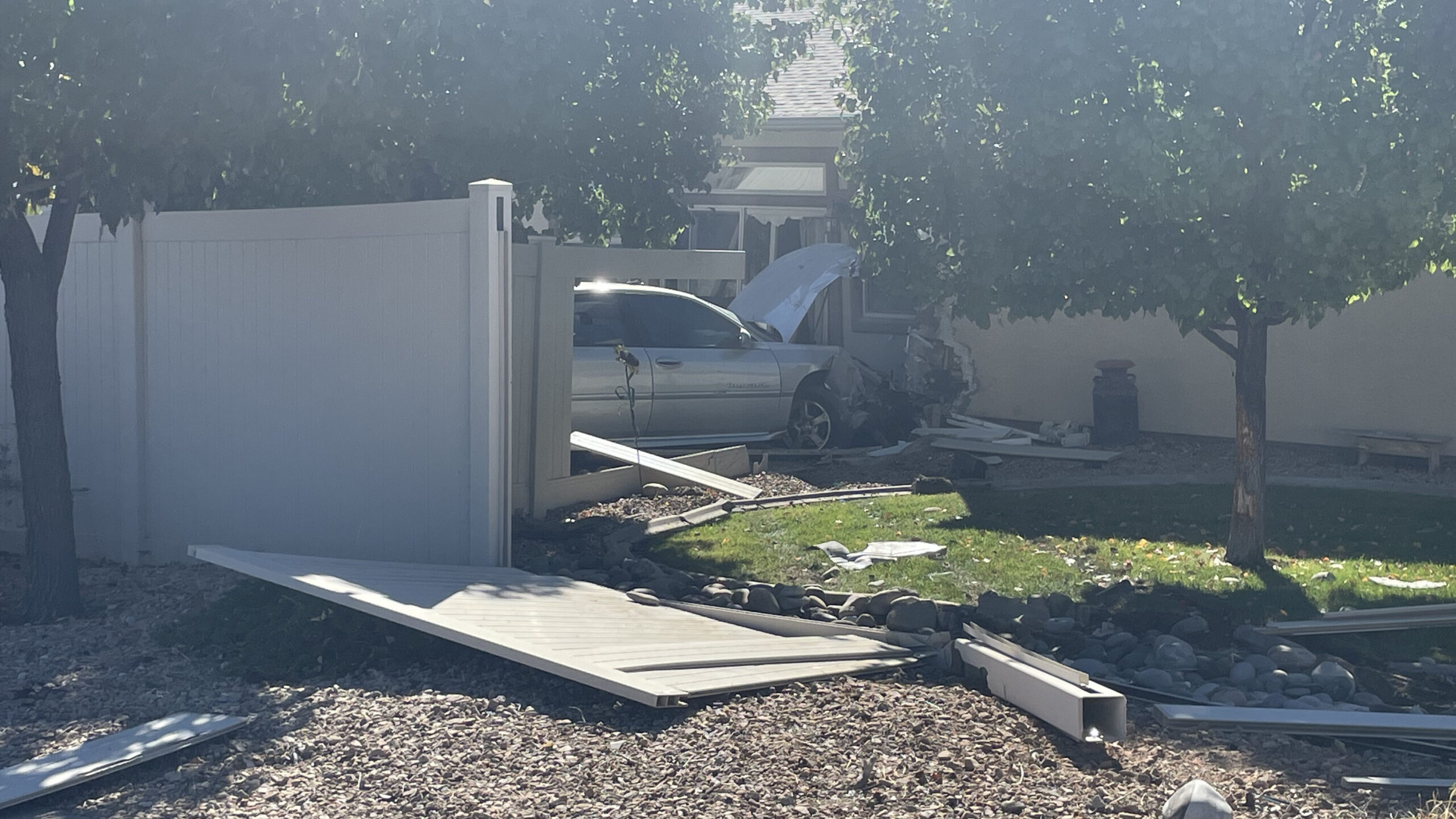 Report of a vehicle into a home on Rio Grande Drive, just west of 28 1/4 Road south of Patterson. Home owner is reporting no injury, but is unable to locate the driver of the vehicle. The car traveled through a fence prior to striking the house. Fire crews arriving on scene report “occupants” are safely out of the vehicle. Radio traffic seems to indicate no injuries.