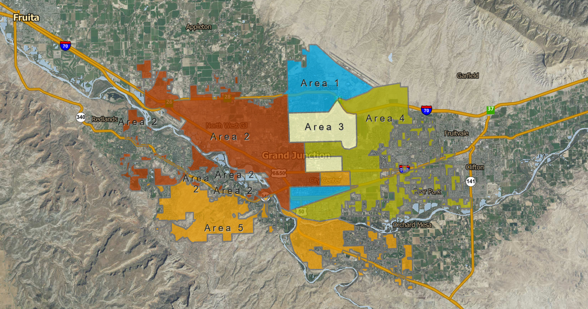 The city is divided into five areas, each with specific rake-out dates. Residents must place leaves at the curb by 7 a.m. on their designated date, 18 inches from the curb, with pick-up occurring within three days, weather permitting. Only leaves and pine needles are accepted. Over 10,000 cubic yards of leaves are collected annually and composted at the Mesa County Organic Materials Composting facility for use in gardens and farmland.