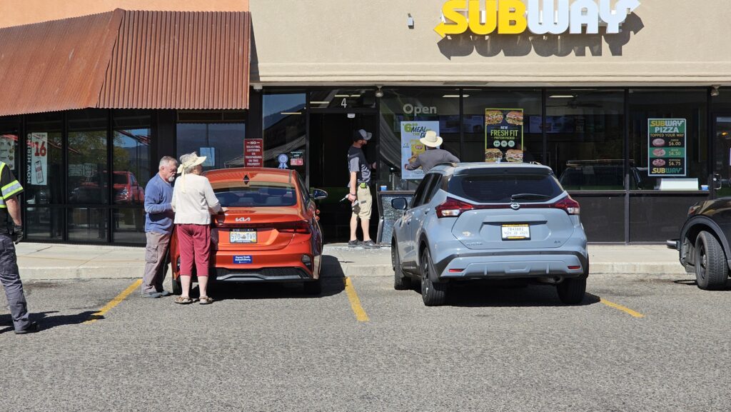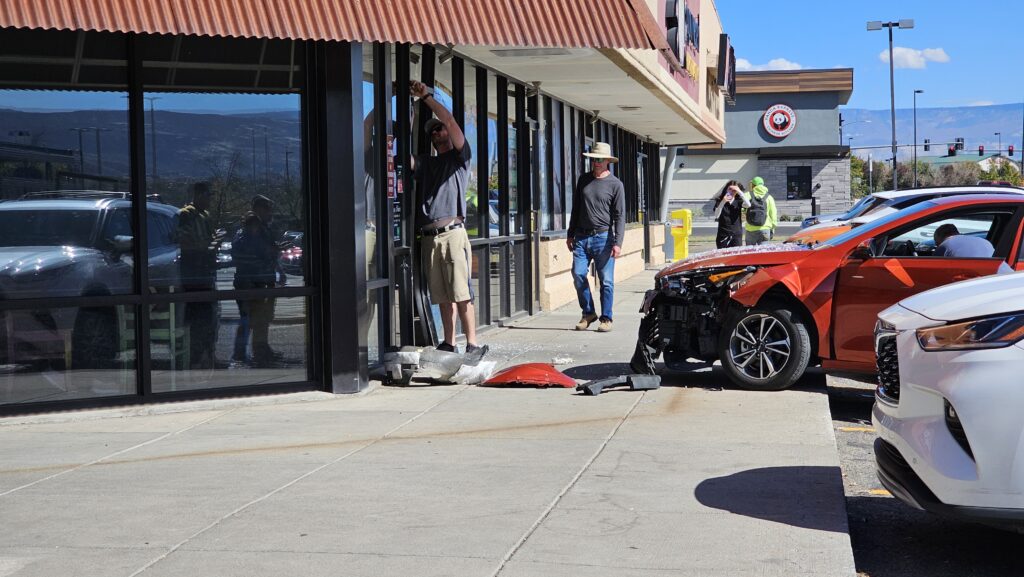 Vehicle driver has crashed into the Cafe Rio building on Patterson Road just east of 24 Road. This comes minutes after a vehicle drove into the JCPenney building at the Mesa Mall on 24 1/2 Road. Vehicle is described as an orange Kia Forte. Female driver describing minor injury.