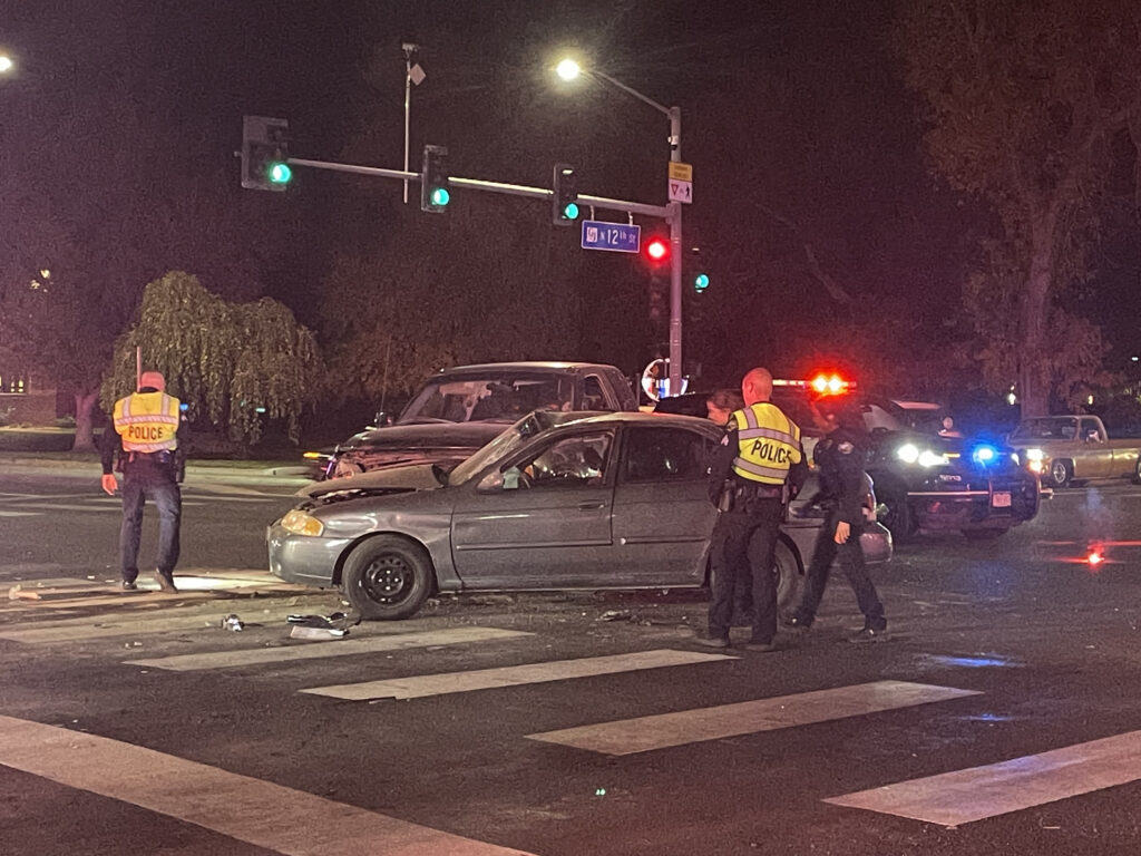 Multi-vehicle accident involving at least 3 vehicles at North Avenue and North 12th Street. Possibly up to five occupants with injuries. At least one 37-year-old female is reporting head, hand, and leg injury. One female involved is pregnant. Known vehicles are a green Ford F-150 truck and gray Nissan Sentra. Eastbound lanes of North Avenue are blocked, with the accident causing heavy traffic congestion in the area. Radio traffic seems to indicate minor to moderate injuries.