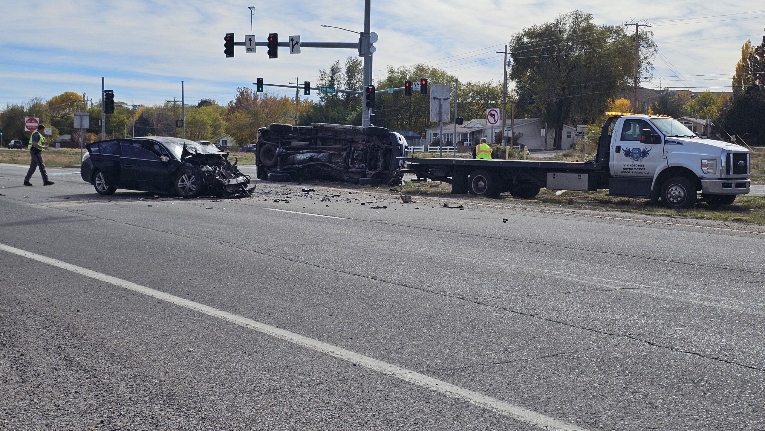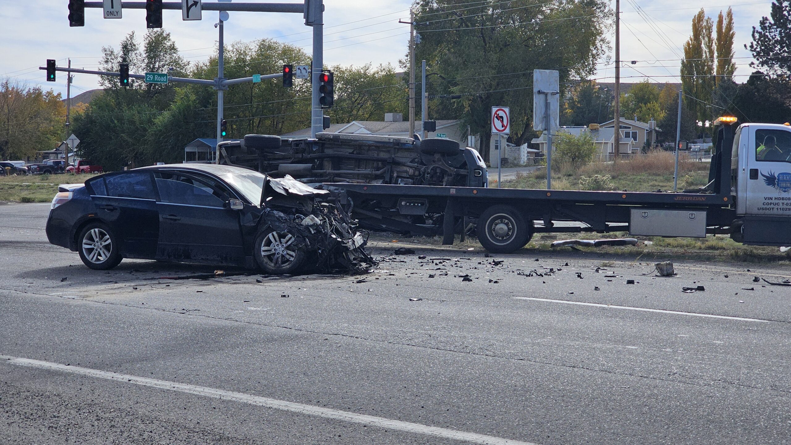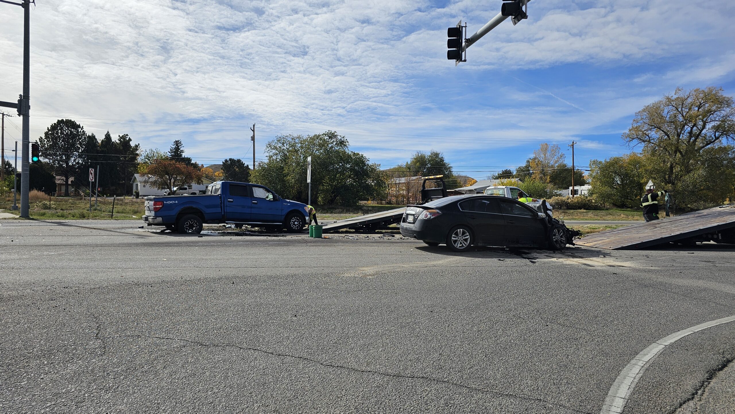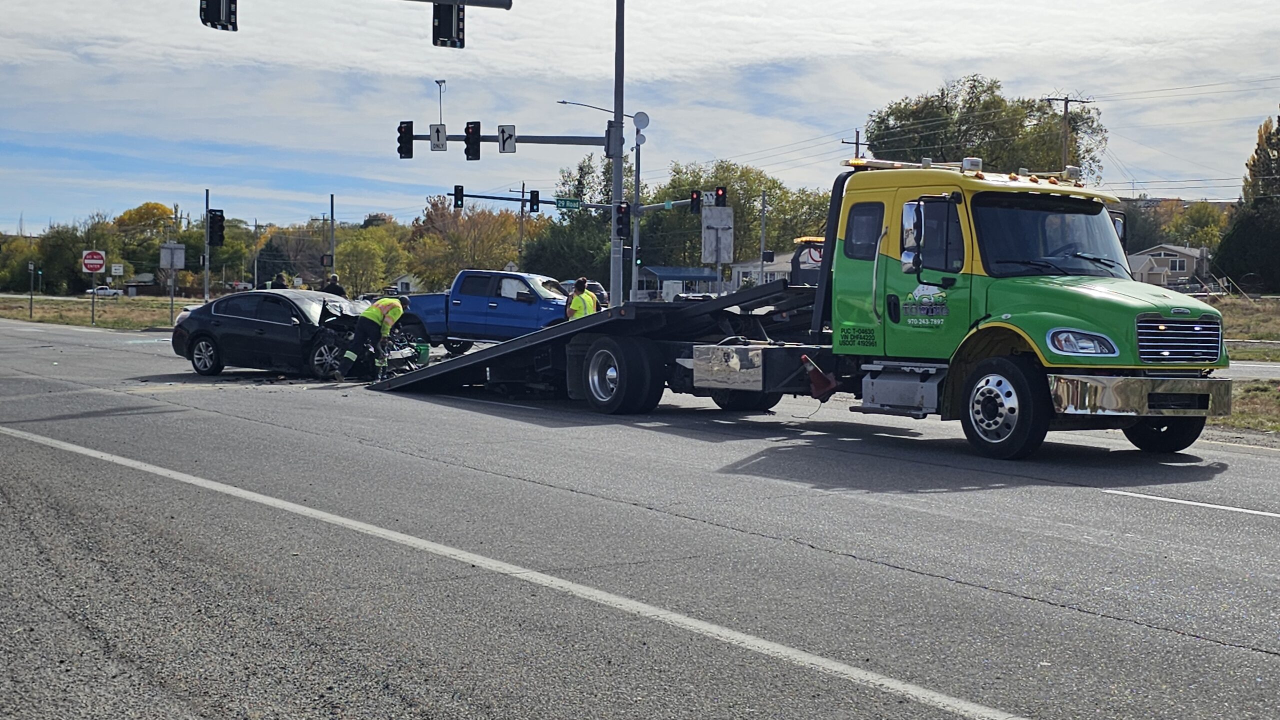 Two vehicle accident with one possibly rolled over near the intersection of Highway 50 and 29 Road in Orchard Mesa. Two people are trapped in a vehicle and one person is complaining of a head injury. Two children possibly involved. A vehicle had caught fire at one point but was extinguished. Additional ambulance requested as well as additional fire engines for man power. Responders are reporting 5 total patients, one possibly critical condition. Vehicles are a blue Ford F-150 and a black Nissan Altima.