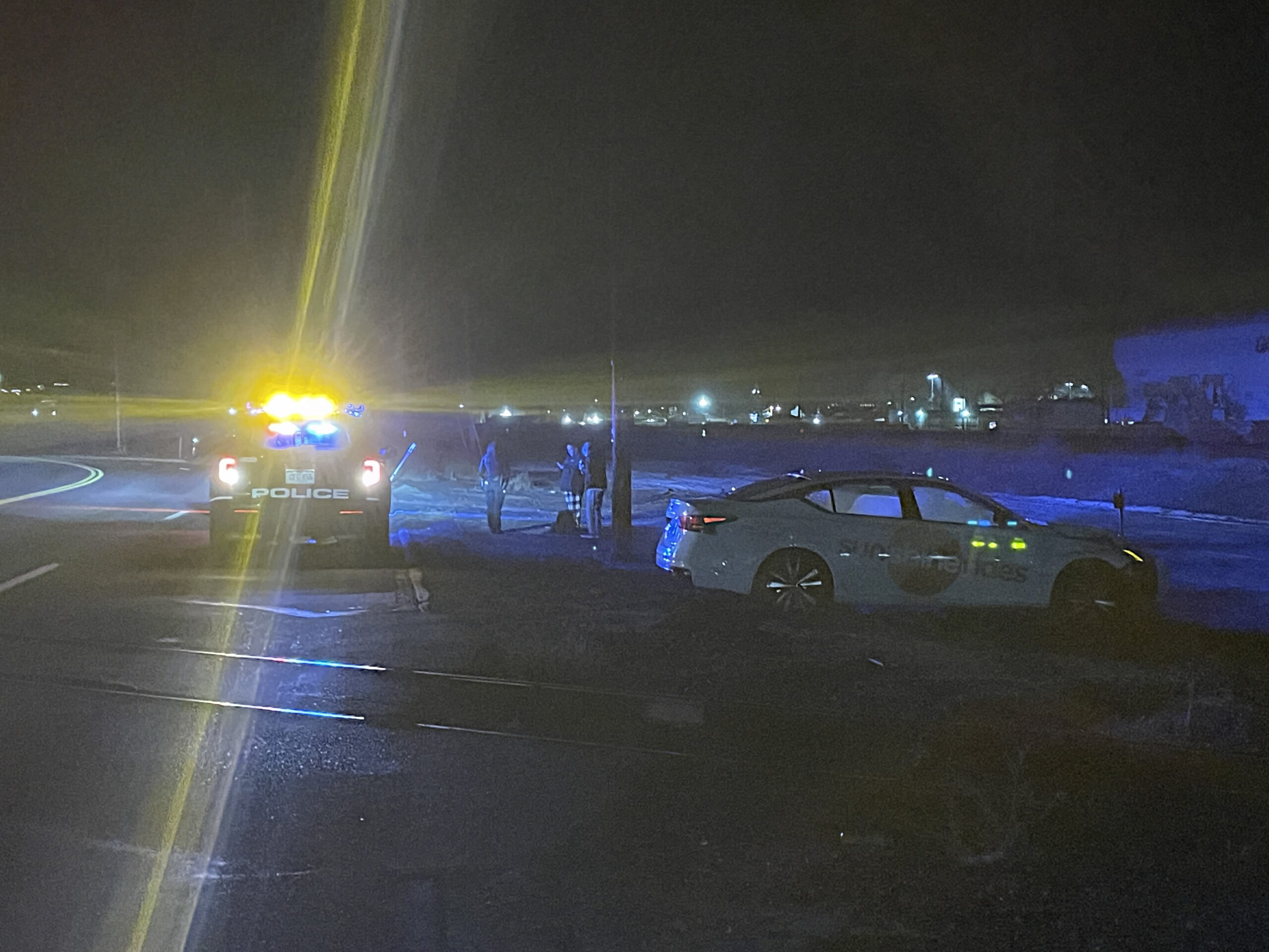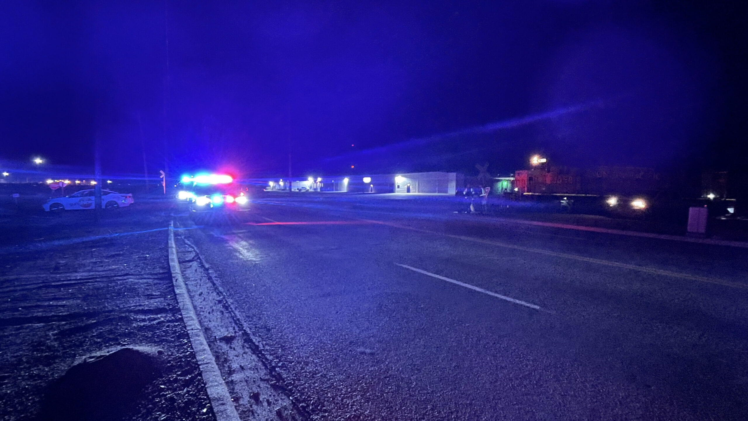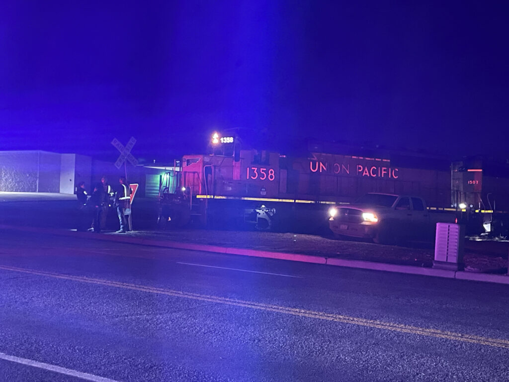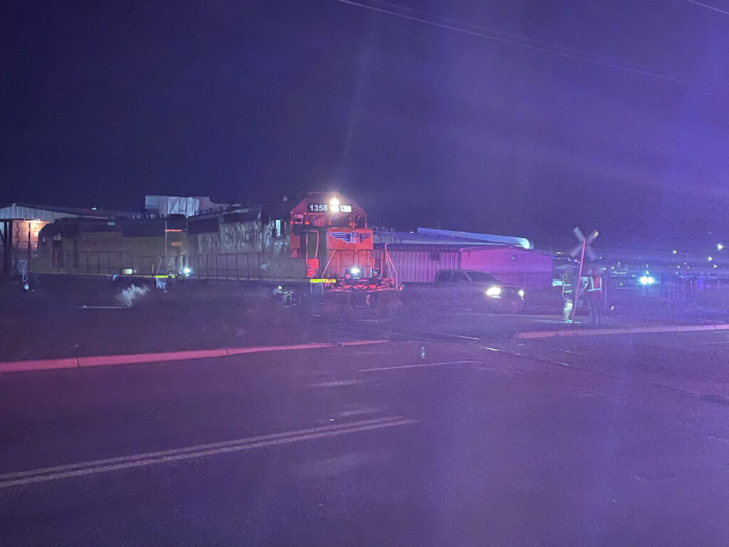 A taxi struck a train in the area of D Road and 12th Street at a limited access crossing. Radio transmissions indicated at least one taxi occupant complained of chest pain and that the vehicle’s airbag had deployed; that patient was later reported conscious and breathing. Two people on the train were reported uninjured. D Road and the railroad crossing at 12th Street are blocked by the accident.