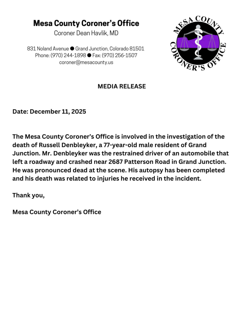 Update Dec. 11, 2025: The Mesa County Coroner’s Office identified the driver as Russell Denbleyker, a 77-year-old Grand Junction man. According to the Coroner, Denbleyker was the restrained driver of a vehicle that left the roadway and crashed near 2687 Patterson Road. He was pronounced dead at the scene, and an autopsy found his death was related to injuries he received in the incident.