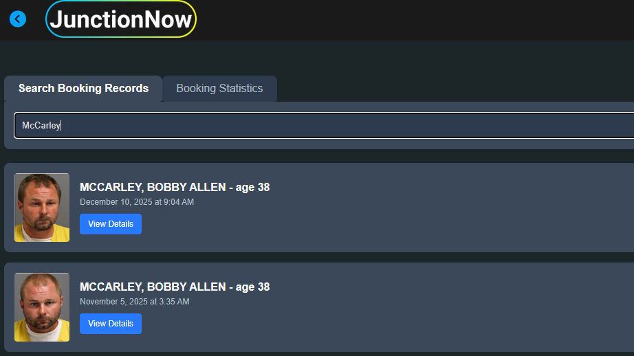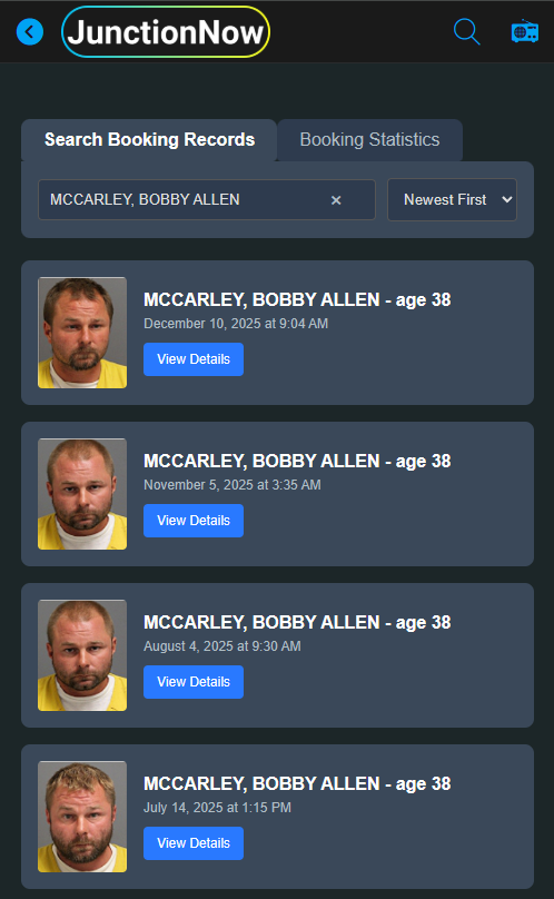 Jail records pictured for Bobby McCarley since July 2025, as recorded in the JunctionNow mobile app.