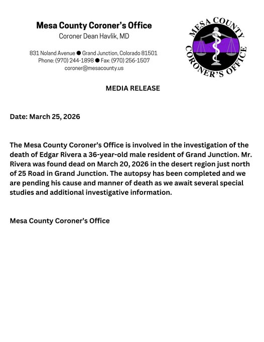 According to a media release issued Wednesday, March 25, the deceased has been identified as Edgar Rivera, 36, a resident of Grand Junction. Rivera was discovered in the desert region just north of 25 Road on March 20, 2026.