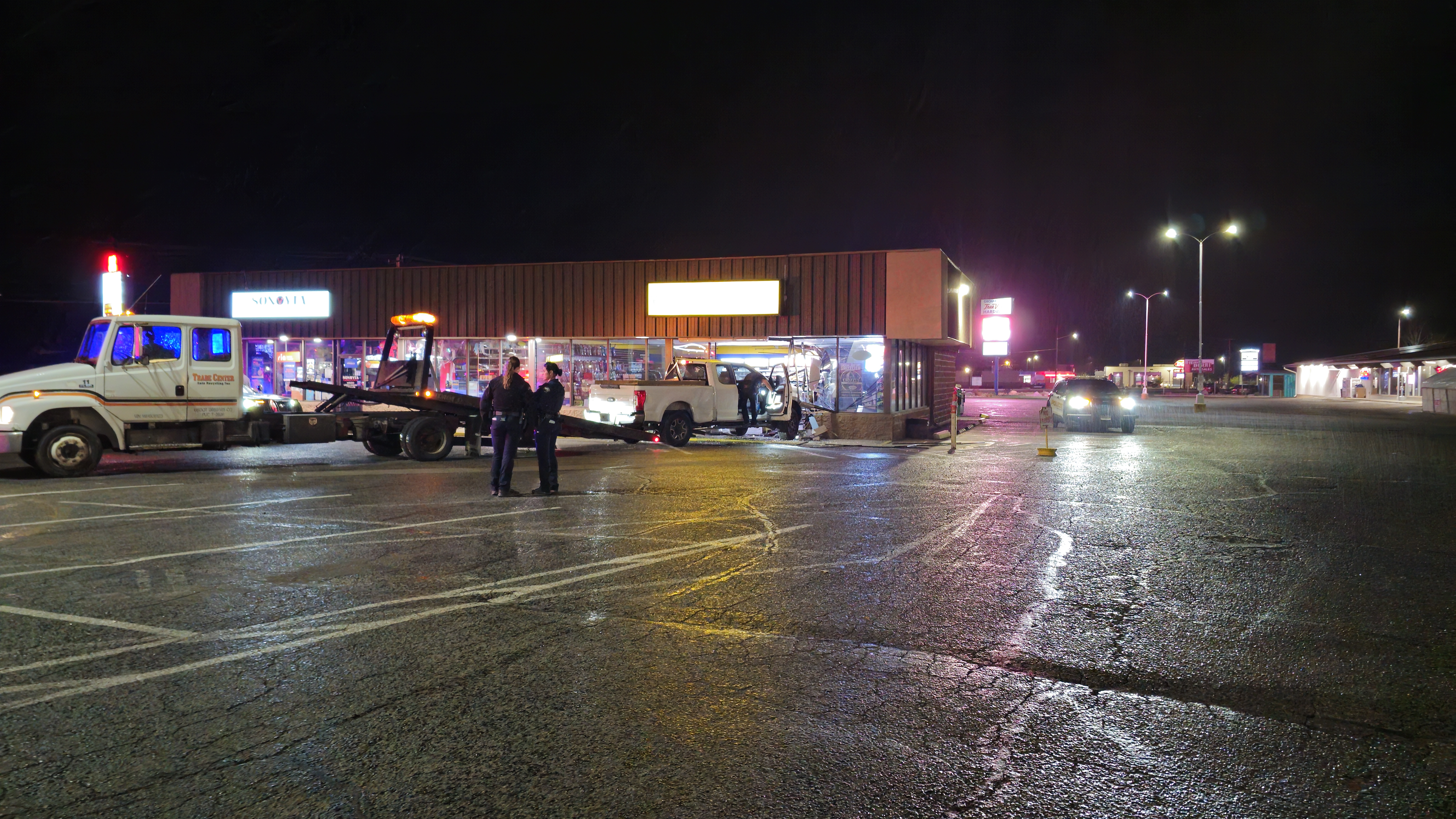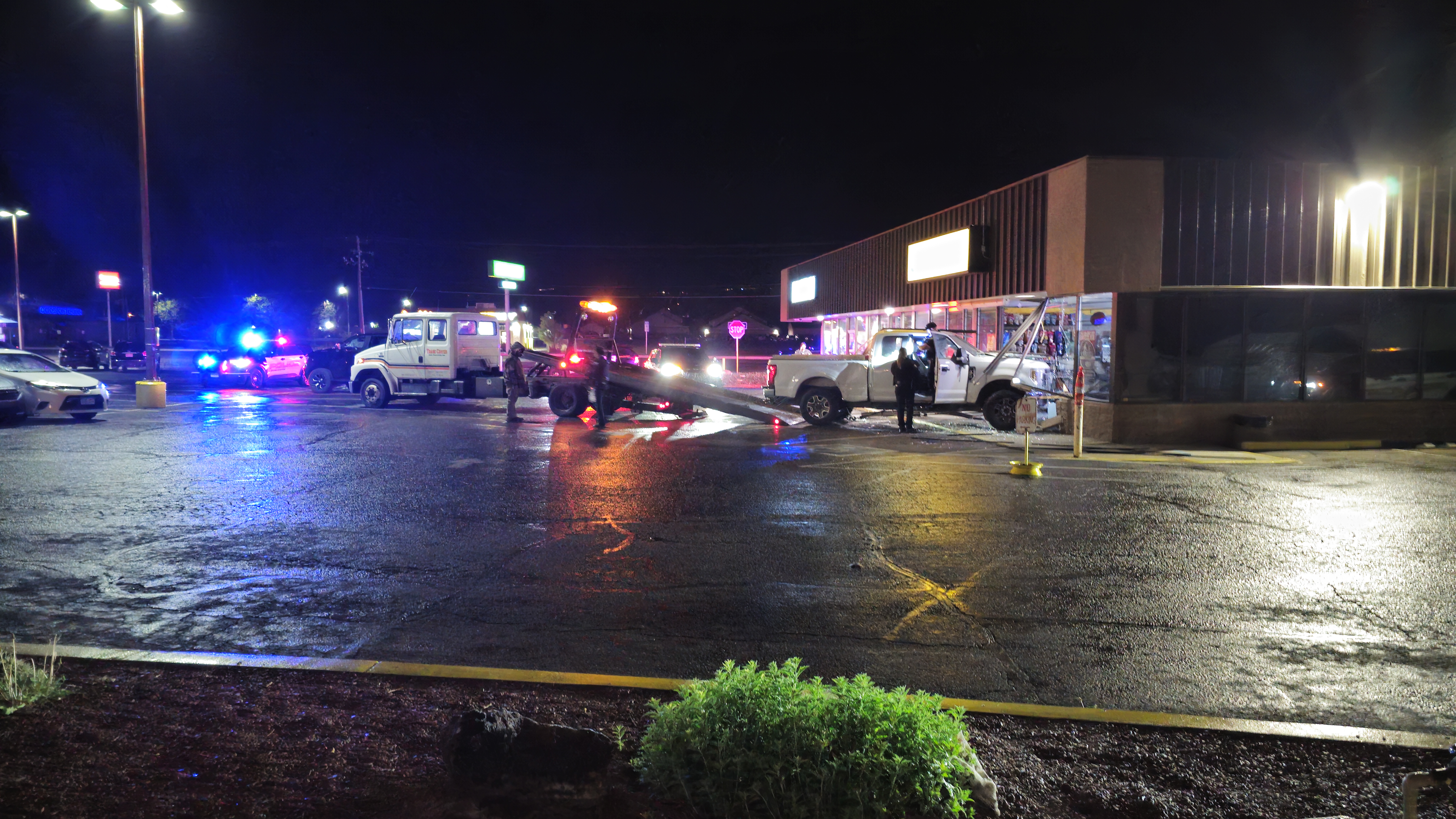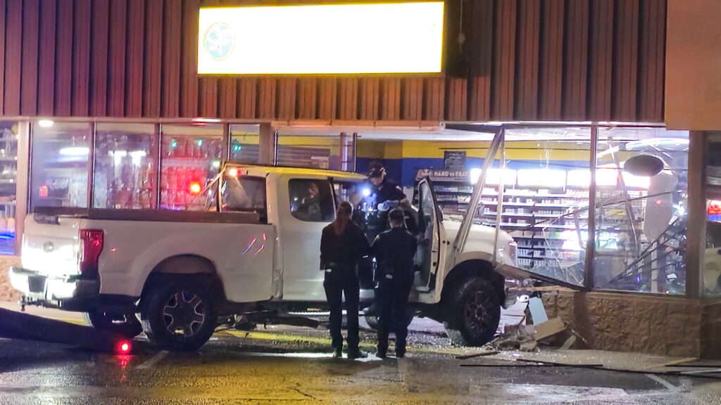 Radio traffic indicated a pickup truck was completely inside the building, was smoking and a male driver was inside the vehicle. Callers reported the vehicle struck a light pole and several other cars prior to driving through the store. The driver was described as a 30-year-old male who was unconscious but breathing and remained inside the vehicle; officers called the incident a possible DUI and requested additional units. Officers administered Narcan as EMS crews arrived on scene.
