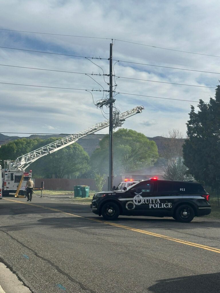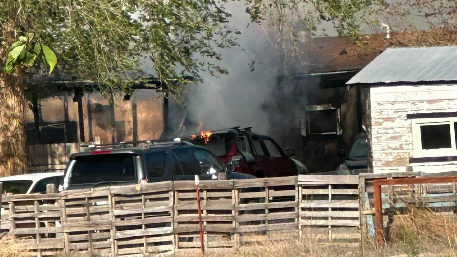 Update 5:54 p.m.: Vehicles and primary house fires are extinguished, firefighters are working to extinguish the attic fire and smoldering debris. Xcel has been dispatched to handle down power lines.